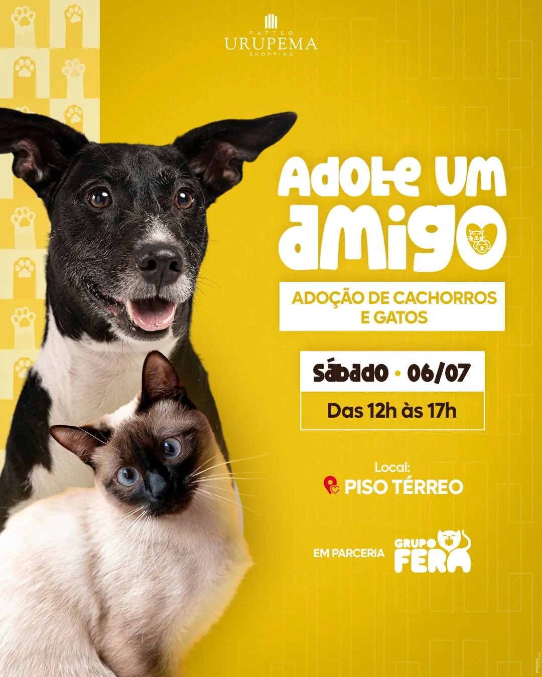 Administrado pela HBR Realty, o Patteo Urupema Shopping oferece uma ampla gama de lojas, gastronomia e entretenimento, além de uma vista panorâmica da Serra do Itapeti. As lojas funcionam de segunda a sábado das 10h às 22h e aos domingos e feriados das 12h às 20h. A praça de alimentação opera em dias úteis das 11h às 22h e nos finais de semana e feriados das 12h às 20h. Localizado na Avenida Voluntário Fernando Pinheiro Franco, 515, Centro de Mogi das Cruzes. Mais informações no site www.patteourupemashopping.com.br, nas redes sociais (@patteourupemashopping) ou pelo telefone (11) 2500-0515. Adote um novo amigo e ajude a proporcionar um lar cheio de carinho para esses animais!